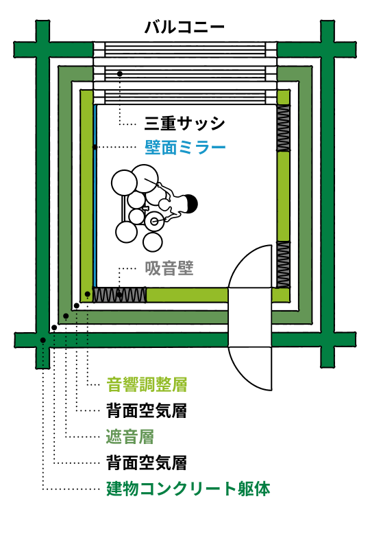 躯体と防音室の壁の間にはグラスウール等を充填した空気層を設けています。