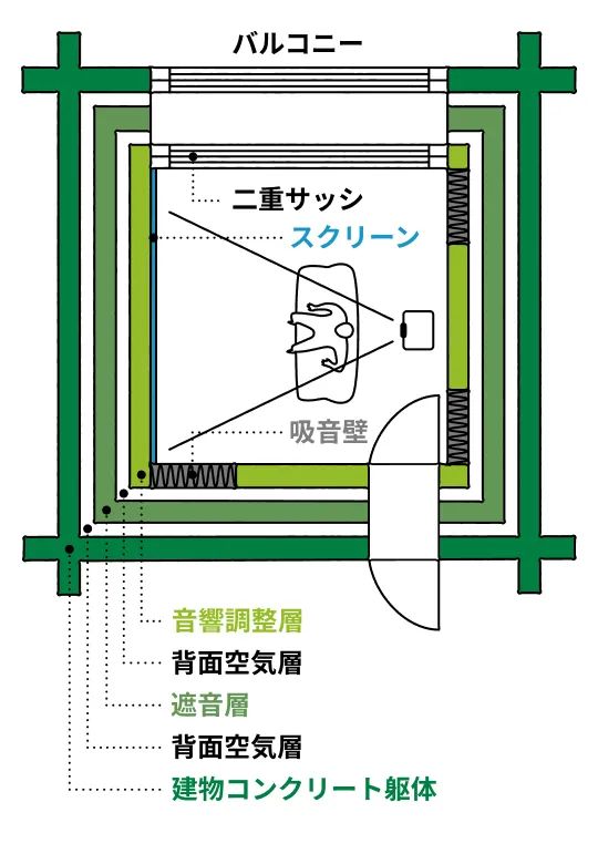 遮音構造の防音室を造る「BOX in BOX構法」を採用。