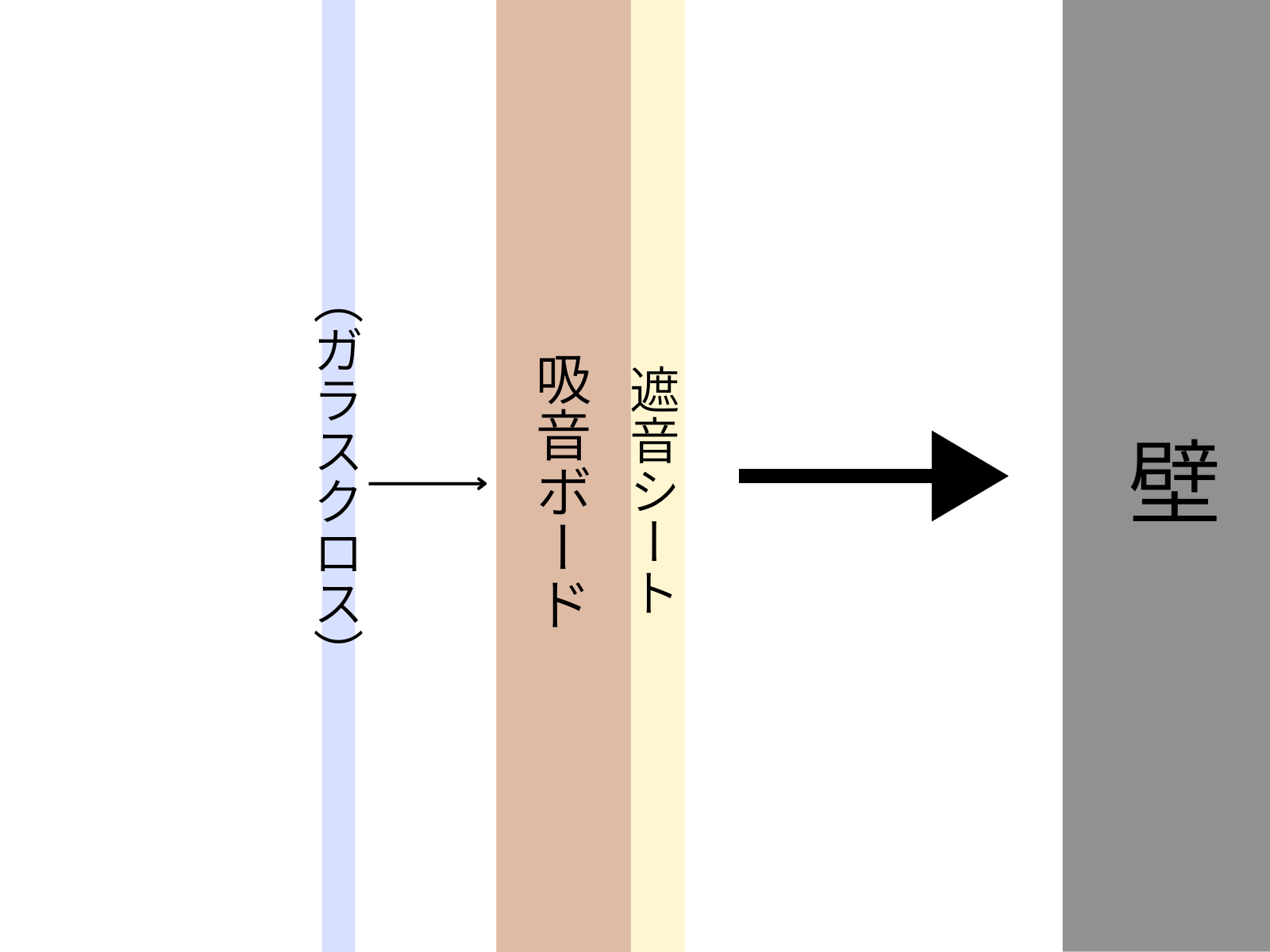 防音構造として、吸音で音を減らしてから遮音するように、基本は吸音ボード→遮音シート→壁の順番に設置できると良いですね。