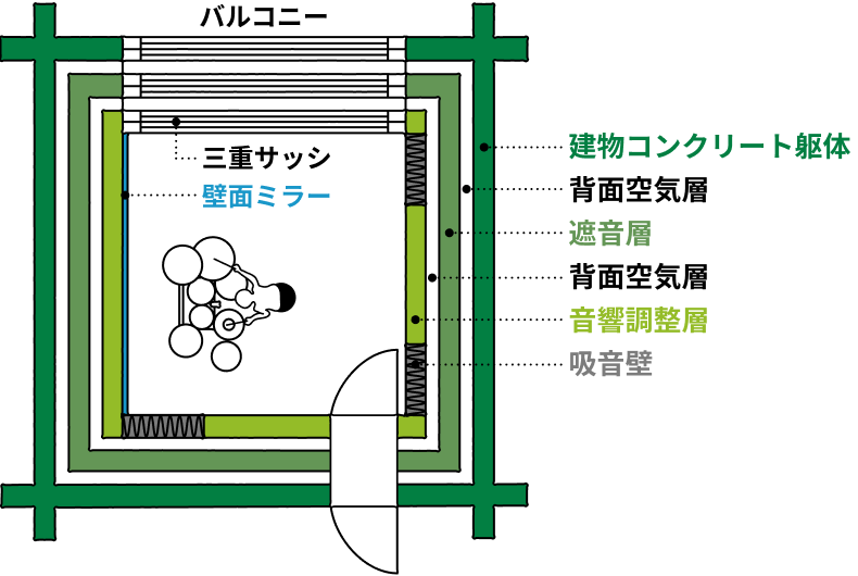 躯体と防音室の壁の間にはグラスウール等を充填した空気層を設けています。