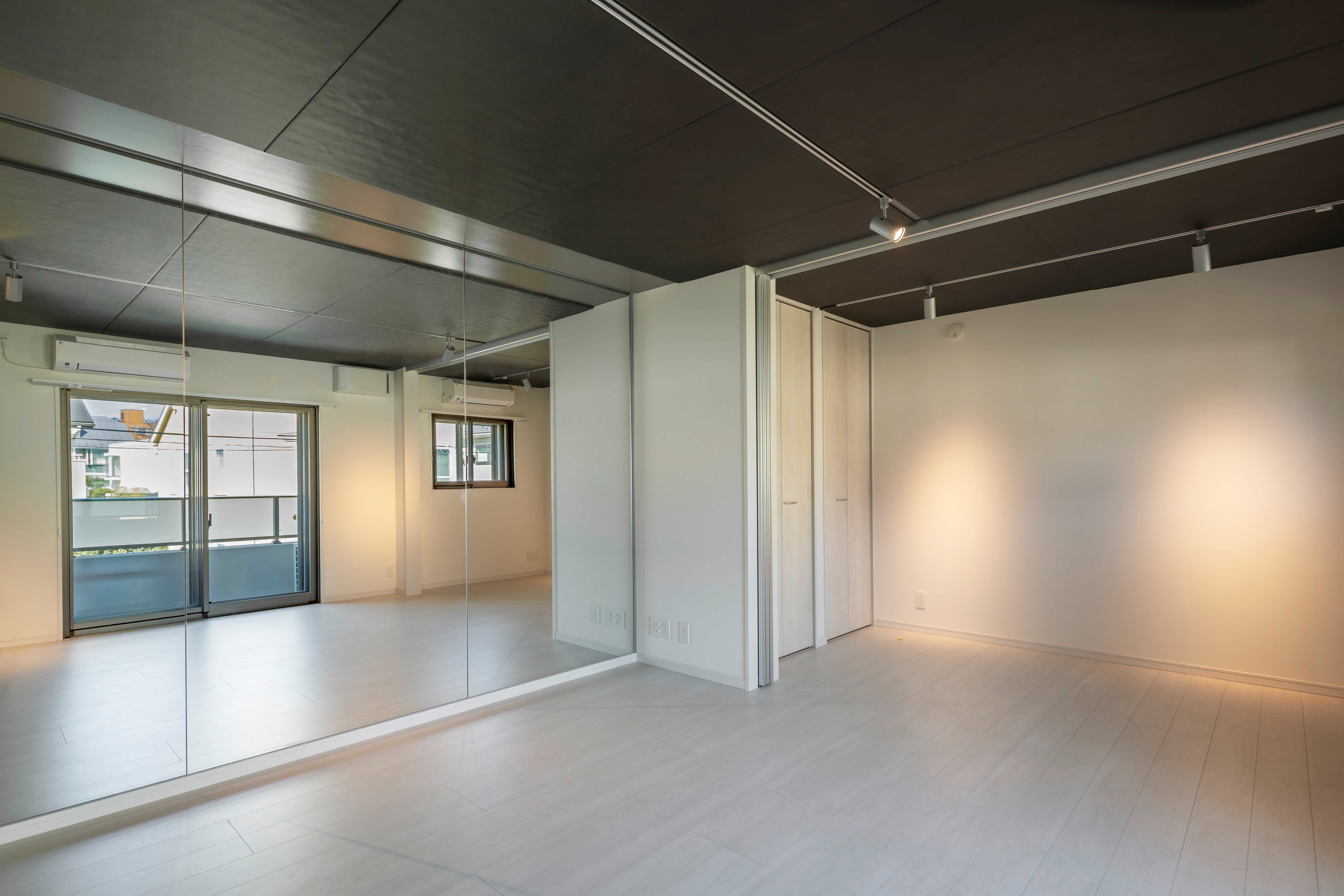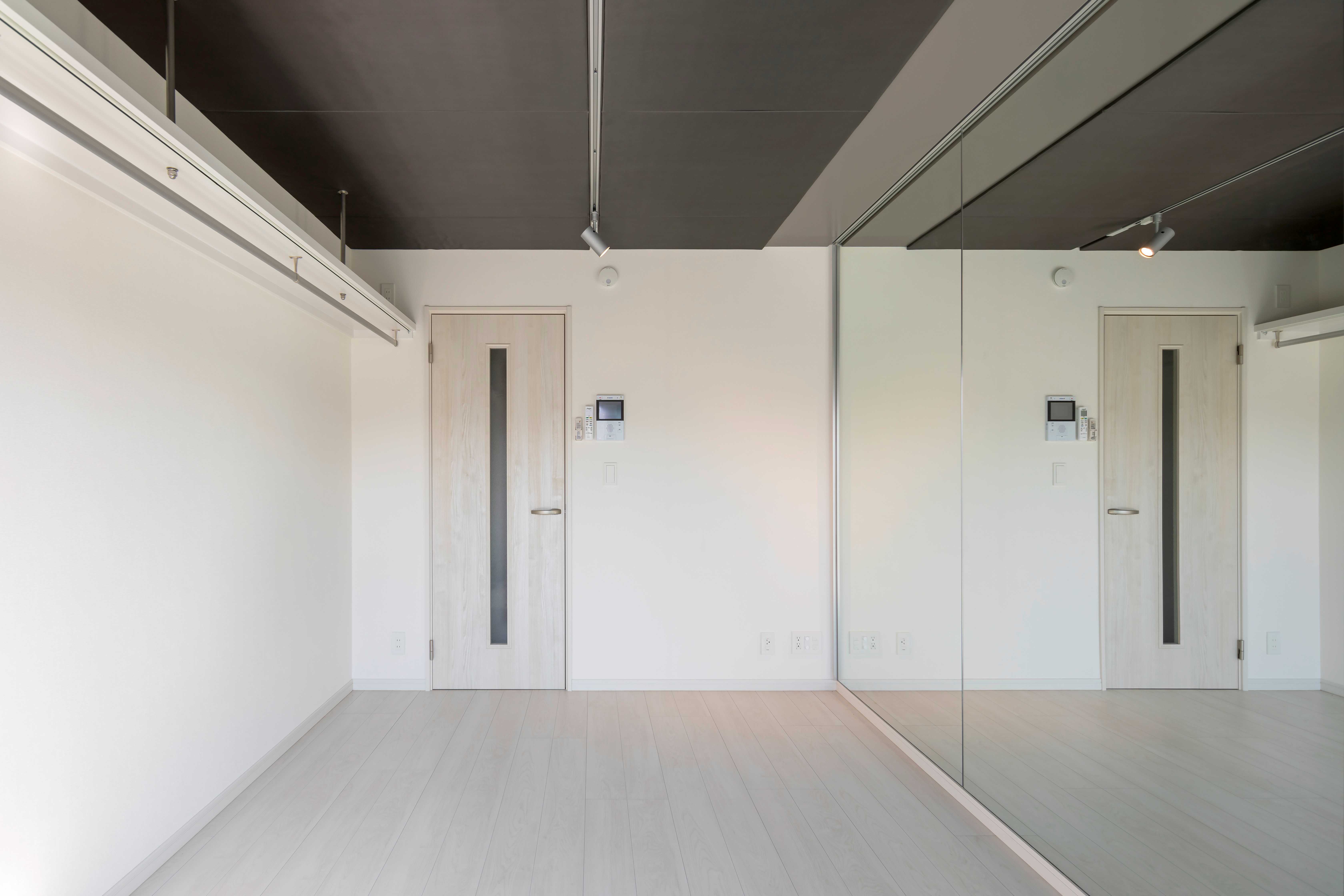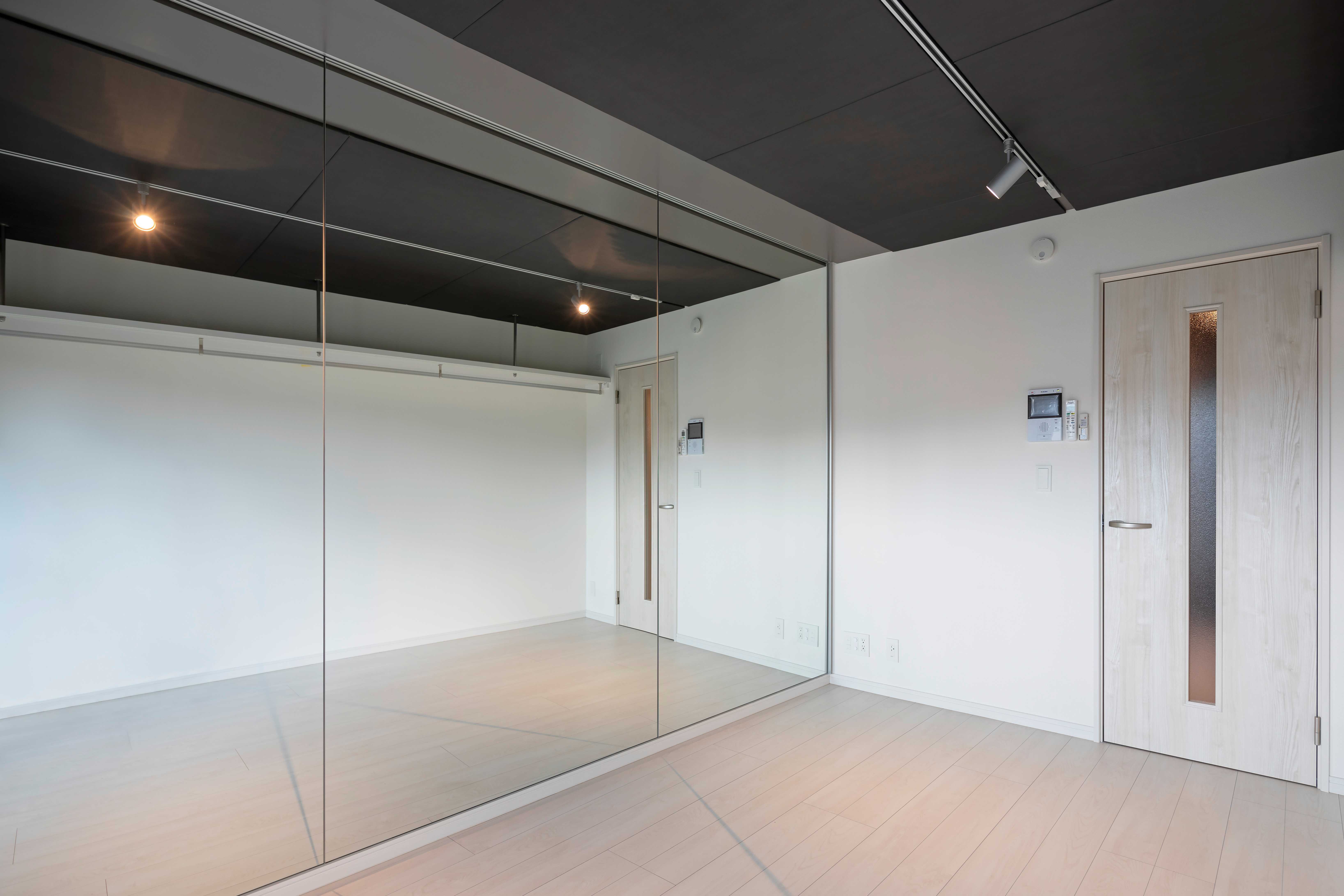 壁1面がミラー張りでフォームチェックも可能。スピーカーは天井に設置可能で足元スッキリ。