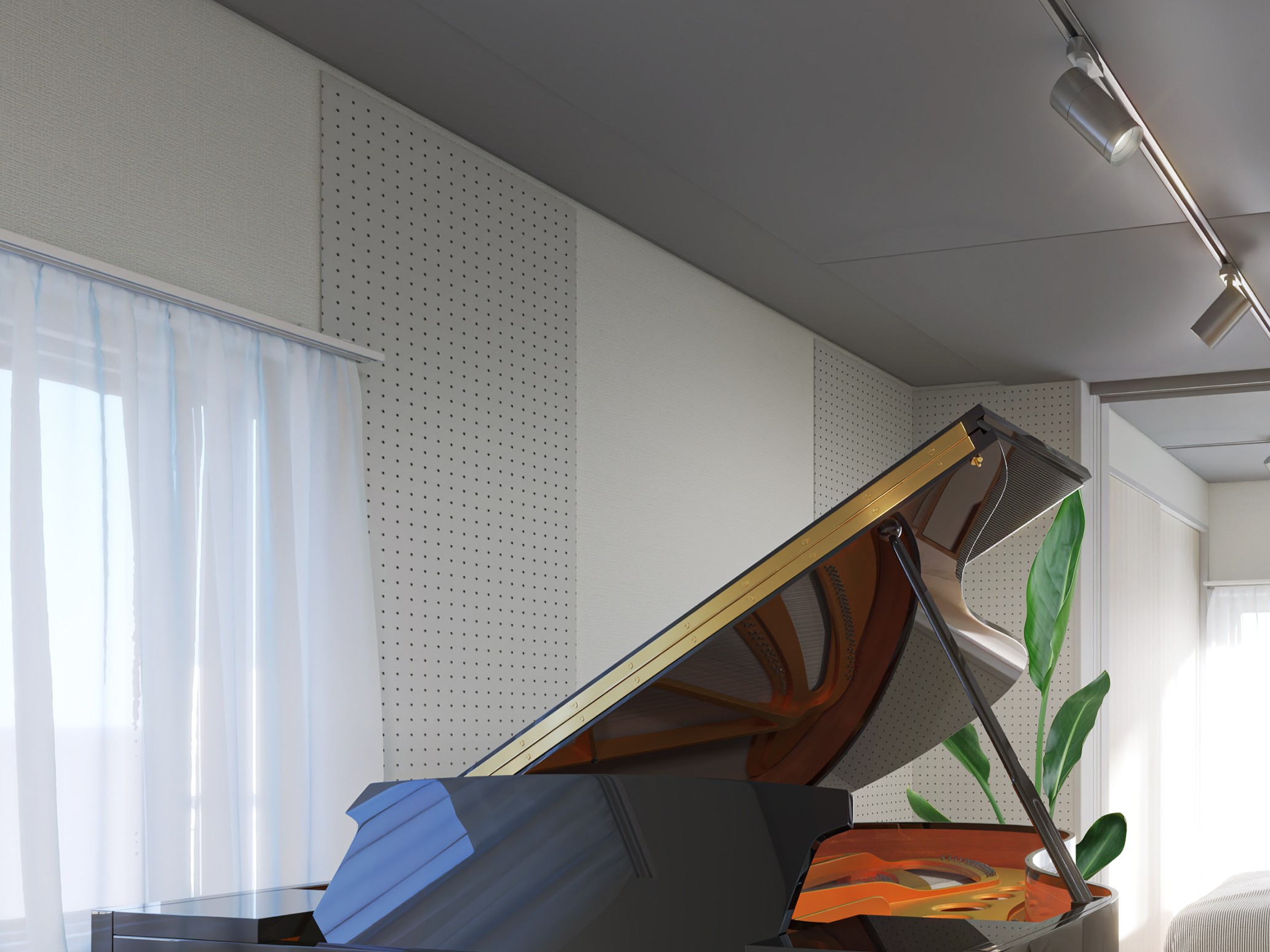 生ドラムを含むロックバンド演奏等に最適な残響時間0.4秒前後を目指して音響設計を行っています。また、天井高を2450mmと従来の物件よりも100mm高くし、壁面には有孔ボードを用いた吸音壁をバランスよく配置することで、歯切れの良いサウンドを実現します。